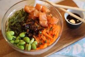 Este prato de origem havaiana é servido em uma pequena tigela e leva basicamente uma porção de peixe fresco, 1 porção de arroz e frutas, vegetais e algas a gosto. O meu preferido é o poke de salmão.